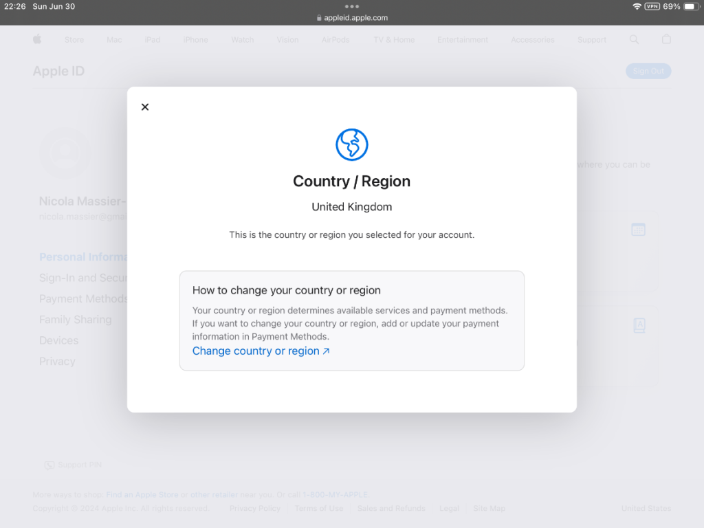 - Klicken Sie auf Land/Region und dann auf Land bzw. Region ändern, um die gewünschte Region sowie eine gültige Zahlungsmethode zu wählen.