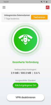 Sie können das VPN für Android kostenlos herunterladen und auf Ihrem Android-Smartphone oder -Tablet installieren. Anschließend können Sie die App einfach öffnen, Ihren gewünschten virtuellen Standort wählen und das VPN mit nur einem Fingertipp starten. Ab jetzt surfen Sie quasi wie ein Phantom und hinterlassen keine Spuren im Internet. Mit unserer kostenlosen VPN-App stehen Ihnen pro Monat 500 MB zur Verfügung. Sollten Sie mehr benötigen, können Sie Ihr Kontingent durch eine kostenfreie Registrierung auf 1 GB erhöhen. Und sollte das immer noch nicht ausreichen, haben Sie jederzeit die Möglichkeit, zu Avira Phantom VPN Pro zu wechseln und unbegrenzt anonym zu surfen (über In-App-Kauf möglich).