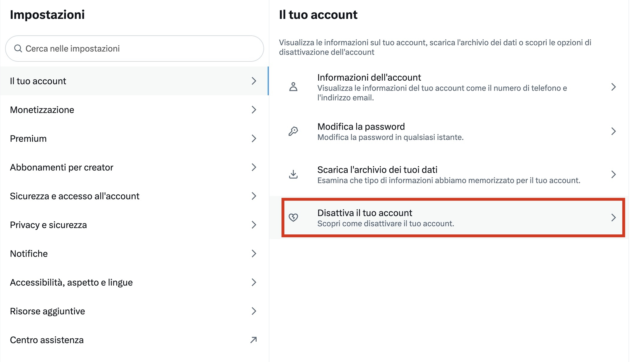 Una disattivazione è per sempre. Non è quindi una decisione da prendere alla leggera. Rifletti attentamente sui motivi per cui hai deciso di andartene e su cosa potrebbe significare per te non essere più presente su Twitter/X. Ricorda inoltre che i tuoi dati rimarranno in possesso di questa società fino a 18 mesi dopo la tua partenza. Leggi l’informativa sulla privacy di X per saperne di più sulla politica di privacy adottata, inclusi i dati raccolti su di te. Tieni inoltre presente che, sebbene le tue informazioni non siano più ricercabili su Twitter, potrebbero comunque essere state indicizzate da motori di ricerca come Google o Bing. I fantasmi dei tuoi tweet e post potrebbero tornare a perseguitarti.