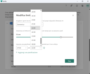 - Imposta una pianificazione: Se desideri stabilire quando il dispositivo può essere disponibile, imposta una pianificazione. In questo modo si impostano gli orari in cui i bambini possono utilizzare il dispositivo. Conferma nuovamente la selezione cliccando su Fine. Puoi applicare la pianificazione a tutti i dispositivi che utilizza il bambino.