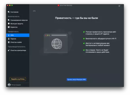 Avira Free Security также включает в себя средства обеспечения приватности и производительности, в том числе бесплатную сеть VPN (500 МБ/мес.), диспетчер паролей и средство очистки от мусора.