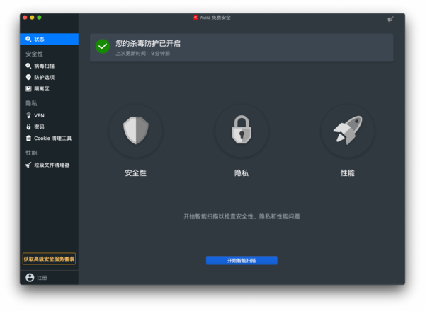Avira 免费安全的智能扫描功能只需单击一次即可检测 Mac 上的安全、隐私和性能问题。